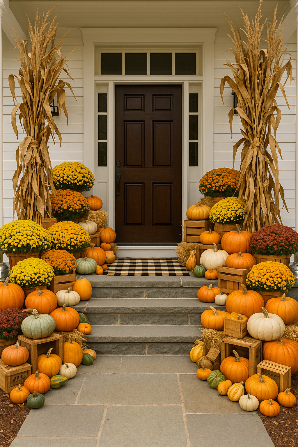 Expect a combination of pumpkins, mums, hay bales, gourds, and natural crates designed to complement your home’s color scheme. Every installation includes thoughtful layering across steps and corners for maximum curb appeal.